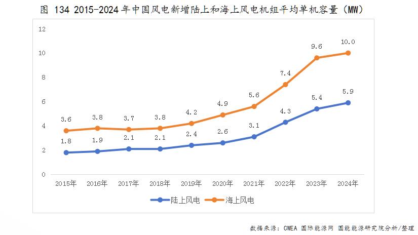 2024年,全国新增装机的风电机组平均单机容量为6046kW,同比增长8.1%,其中陆上风电机组平均单机容量5886kW,同比增长9.6%;海上风电机组平均单机容量为9981kW,同比增长3.9%。