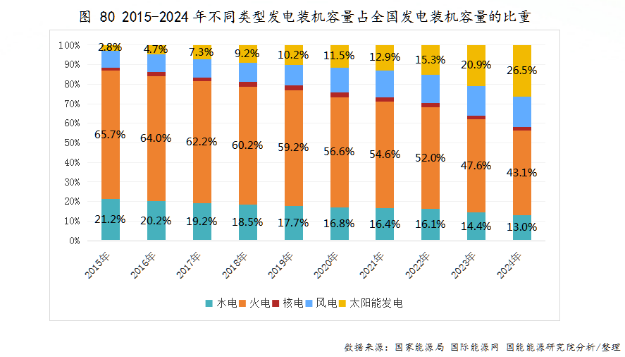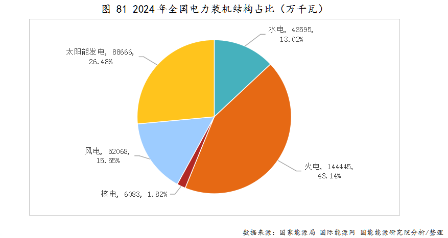 非化石能源总装机量连续四年超过煤电。截至2024年底,全国发电总装机容量为33.5亿千瓦,非化石能源发电装机占总装机容量的比重为56.86%,已连续四年超过煤电。风电装机容量突破5.21亿千瓦,占全国发电装机的15.55%;太阳能发电装机容量突破8.87亿千瓦,占全国发电装机的26.48%。