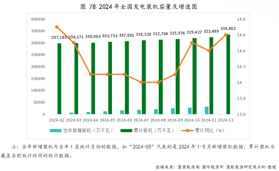 截至2024年12月底,全国累计发电装机容量334862万千瓦,同比增长14.6%。其中,水电装机容量43595万千瓦,同比增长3.2%;火电装机容量144445万千瓦,同比增长3.8%;核电装机容量6083万千瓦,同比增长6.9%;并网风电装机容量52068万千瓦,同比增长18.0%;并网太阳能发电装机容量88666万千瓦,同比增长45.2%。
