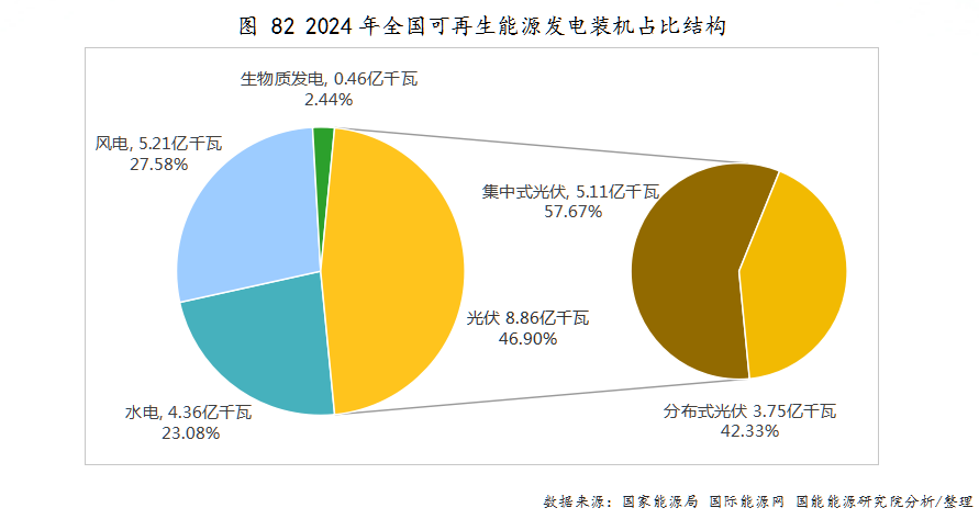 截至2024年底,全国可再生能源装机达到18.89亿千瓦,同比增长25%,约占我国总装机的56%。其中,水电装机4.36亿千瓦;风电装机5.21亿千瓦(其中陆上风电4.8亿千瓦,海上风电4127万千瓦);太阳能发电装机8.87亿千瓦(其中集中式光伏5.11亿千瓦,分布式光伏3.75亿千瓦);生物质发电装机0.46亿千瓦。