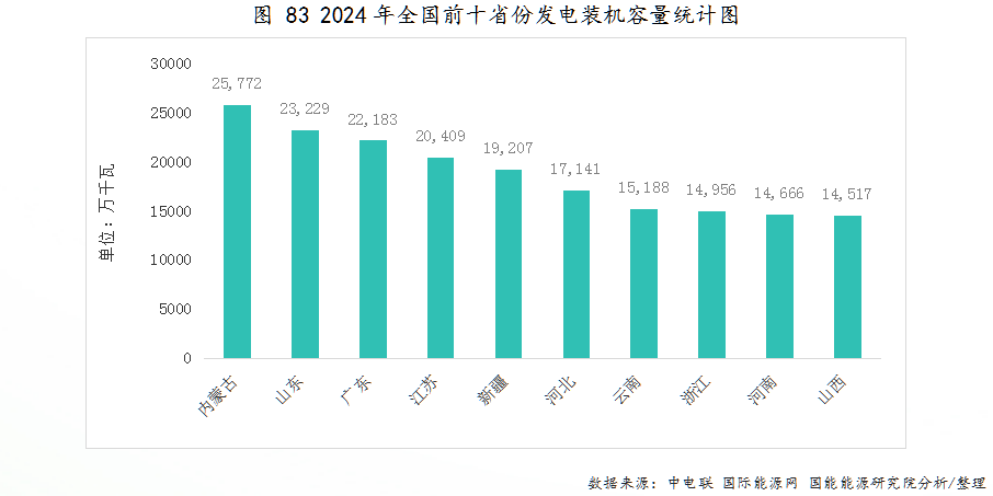 截至2024年12月底,全国十大发电装机省份分别是:内蒙古、山东、广东、江苏、新疆、河北、云南、浙江、河南、山西。内蒙古丰富的煤炭资源和良好的地理位置优势,为其电力产业发展提供了有力支持,是全国风电装机最大的省份。山东作为全国重要的能源基地,煤炭、风能和太阳能等多种能源共同推动其电力产业发展。广东则凭借沿海优势,大力发展核电、风电等清洁能源,成为全国清洁能源发电的重要基地。内蒙、山东、广东分别以25772万千瓦、23229万千瓦和22183万千瓦的发电装机容量排名前三。