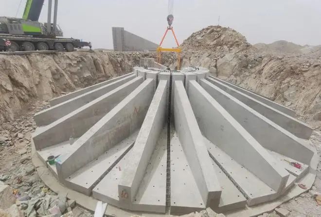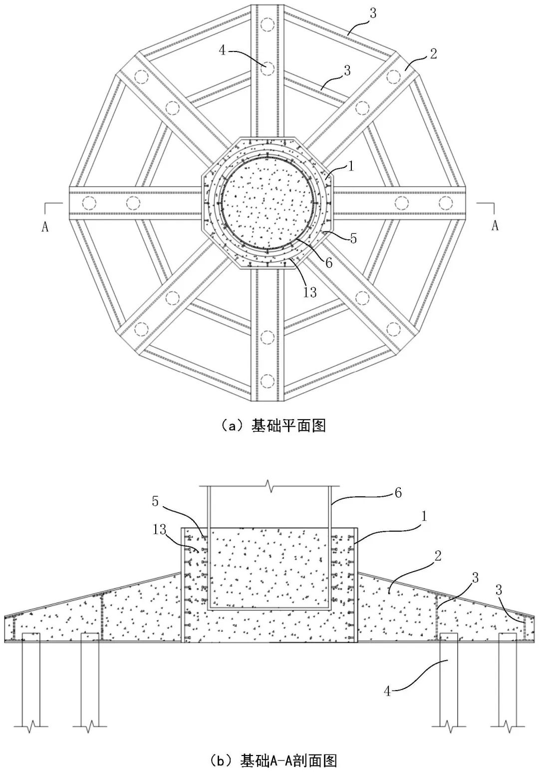 梁板式风机基础由基础台柱、基础底板、从台柱悬挑出的放射状主梁以及封边次梁构成,主梁格间通常用素土夯实,底面一般呈八边形或圆形 。上部荷载经由基础环传递至主梁,再由主梁传递给次梁和地基。相较于重力式扩展基础,梁板式基础的混凝土用量大幅减少,能够在一定程度上改善大体积混凝土因水化热产生温度应力对浇筑造成的不利影响,具有较好的经济性。