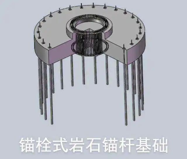 当地基为承载能力良好的岩石地基时,可采用锚栓式岩石锚杆基础。这种基础的主体与塔架通过锚栓连接,主体再通过锚杆锚固于基岩之中,充分利用了基岩的承载力,能显著减少基础混凝土和钢筋的工程量,有效降低成本。但该形式对锚栓锚杆的质量要求极高,锚杆的防腐也需要进行专项设计。