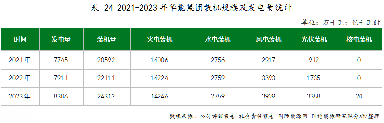2023年华能集团发电量为8306亿千瓦时,装机容量为24312万千瓦,其中火电装机容量14246万千瓦,水电装机容量2759万千瓦,风电装机容量3929万千瓦,光伏装机容量3358万千瓦,核电装机容量20万千瓦。