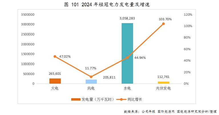 2024年,桂冠电力总发电量3642455.18万千瓦时,同比增长27.77%。其中火电发电量265601.24万千瓦时,同比增长47.02%;风电发电量205810.61万千瓦时,同比增长11.77%;水电发电量3058282.81万千瓦时,同比增长44.94%;光伏发电量112760.52万千瓦时,同比增长103.7%。
