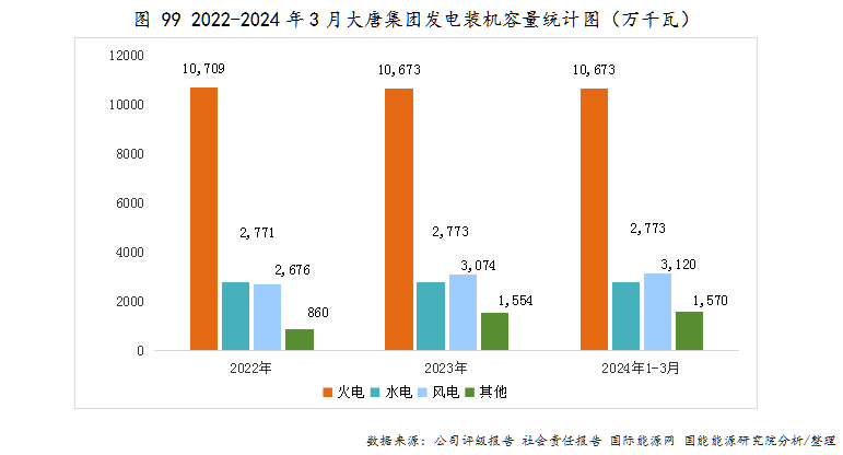 截至2024年3月,大唐集团发电装机容量为18135.87万千瓦,其中火电装机10672.6万千瓦,水电装机2773.24万千瓦,风电装机3120.02万千瓦。