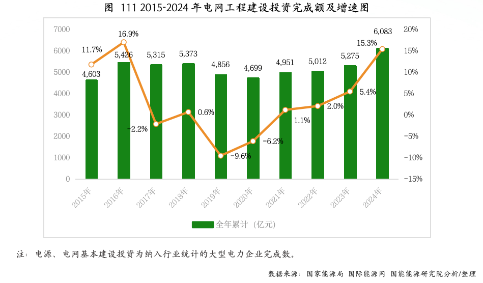 报告总结分析了电力基础设施建设的情况。据国家能源局数据显示,2024年主要发电企业电源工程完成投资11687亿元,同比增长12.1%。“十四五”期间投资额开始上升,2024年电网工程完成投资6083亿元,同比增长15.3%。