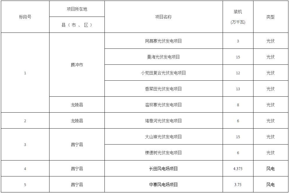 1.1保山市2025年第一批新能源项目涉及8个光伏和2个风电项目,共按以下5个标段进行优选活动: