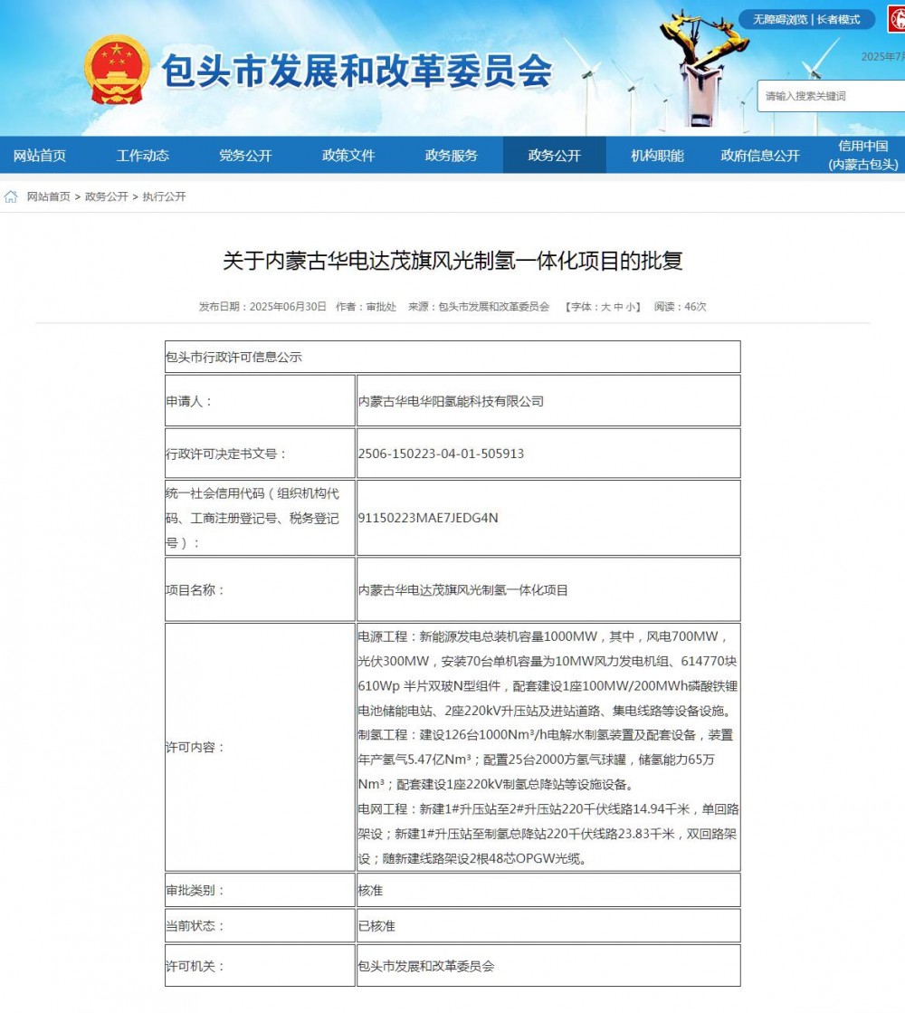 6月30日,内蒙古包头市发展和改革委员会发布关于内蒙古华电达茂旗风光制氢一体化项目的批复。