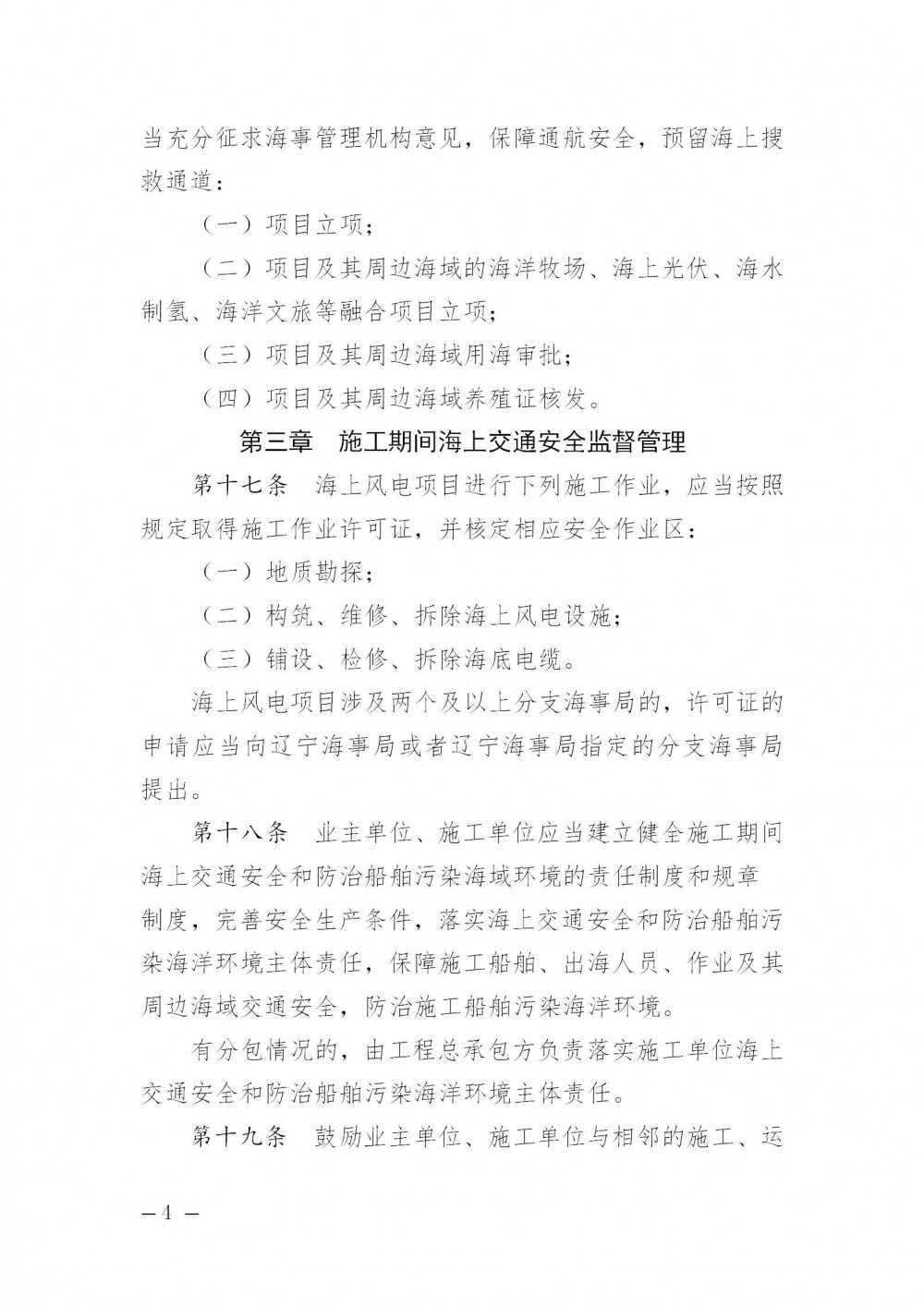 内容指出,在辽宁海事局管辖海域内从事海上风电规划、立项、施工、运维、弃置以及其他与海上交通安全和防治船舶污染海洋环境相关的活动,适用本规定。
