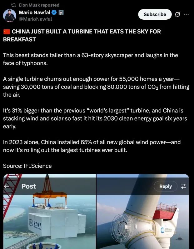 特朗普近日在白宫前发表演讲称没有在中国看到过风电场。此言一出,不仅中国民众哗然,美国民众一样哗然。甚至美国本土企业家马斯克也忍不住发了一张中国风电场的图文回怼“该机组有63 层楼高,笑对台风。”