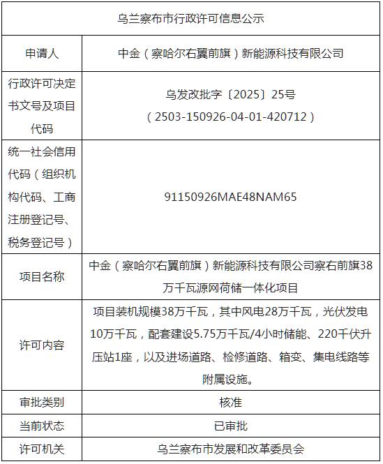 中金(察哈尔右翼前旗)新能源科技有限公司察右前旗38万千瓦源网荷储一体化项目装机规模38万千瓦,其中风电28万千瓦,光伏发电10万千瓦,配套建设5.75万千瓦/4小时储能、220千伏升压站1座,以及进场道路、检修道路、箱变、集电线路等附属设施。
