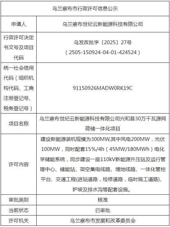 乌兰察布世纪云新能源科技有限公司兴和县30万千瓦源网荷储一体化项目建设新能源装机规模为300MW,其中风电200MW,光伏100MW,同时配套15%/4h(45MW/180MWh)电化学储能系统,同步建设一座110kV新能源升压站及运行管理中心、储能站、架空集电线路、埋地线路、一体化管控平台、交通工程(进站道路,检修道路,临时施工道路)、护坡及排水沟等配套设施。