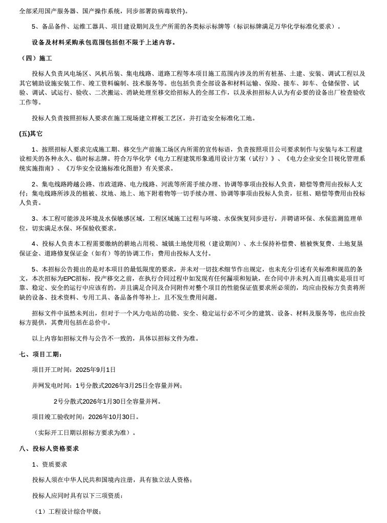 从招标文件看,两个项目中一个规模较大,项目容量212.5MW,另一个项目属于分散式风电,规模只有70MW。