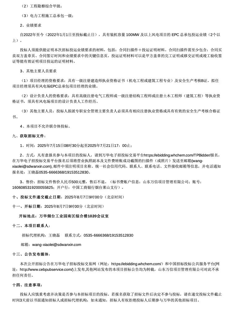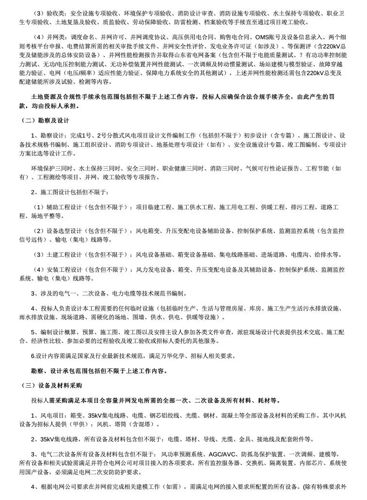 万华海阳70MW分散式风电项目EPC工程总承包,标段一是37.5MW分散式风电项目整体施工;标段二是32.5MW分散式风电项目整体施工。