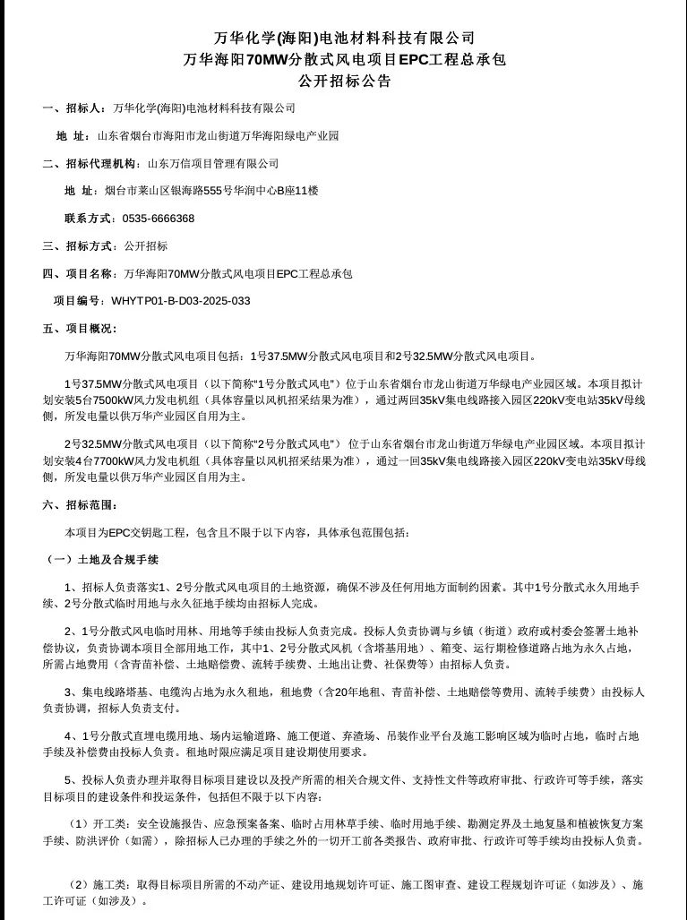 万华海阳70MW分散式风电项目EPC工程总承包,招标单位是万华化学(海阳)电池材料科技有限公司。