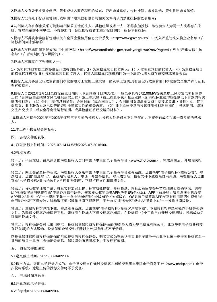 两个项目都分两个标段进行招标。山东华电潍坊高密大牟家212.5MW风电项目主体施工总承包标段一为11台风电机组设备及建安工程,标段二为23台风电机组设备及建安工程。