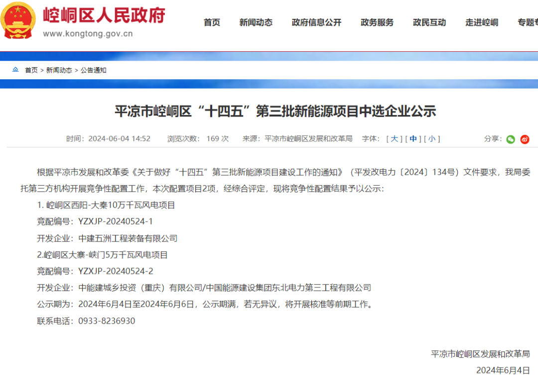 据悉,6月4日,甘肃平凉市崆峒区人民政府发布平凉市崆峒区“十四五”第三批新能源项目中选企业公示。
