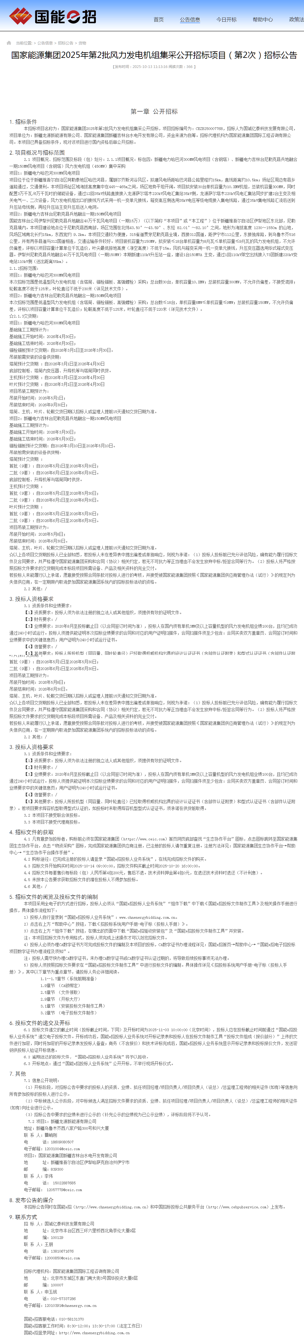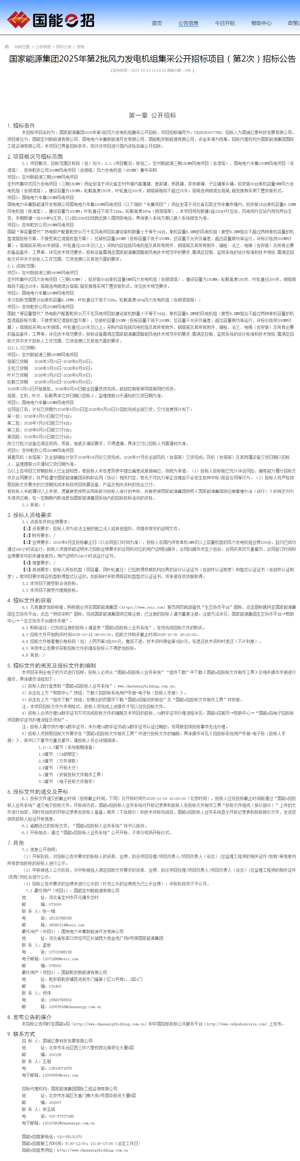 电力家获悉,10月13日,国家能源集团2025年第2批风力发电机组集采公开招标项目(第2次)招标公告发布。