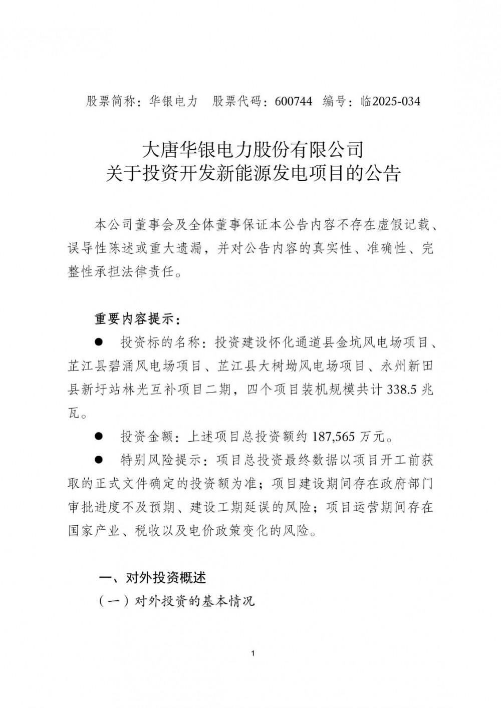 10月31日,大唐华银电力股份有限公司发布关于投资开发新能源发电项目的公告。