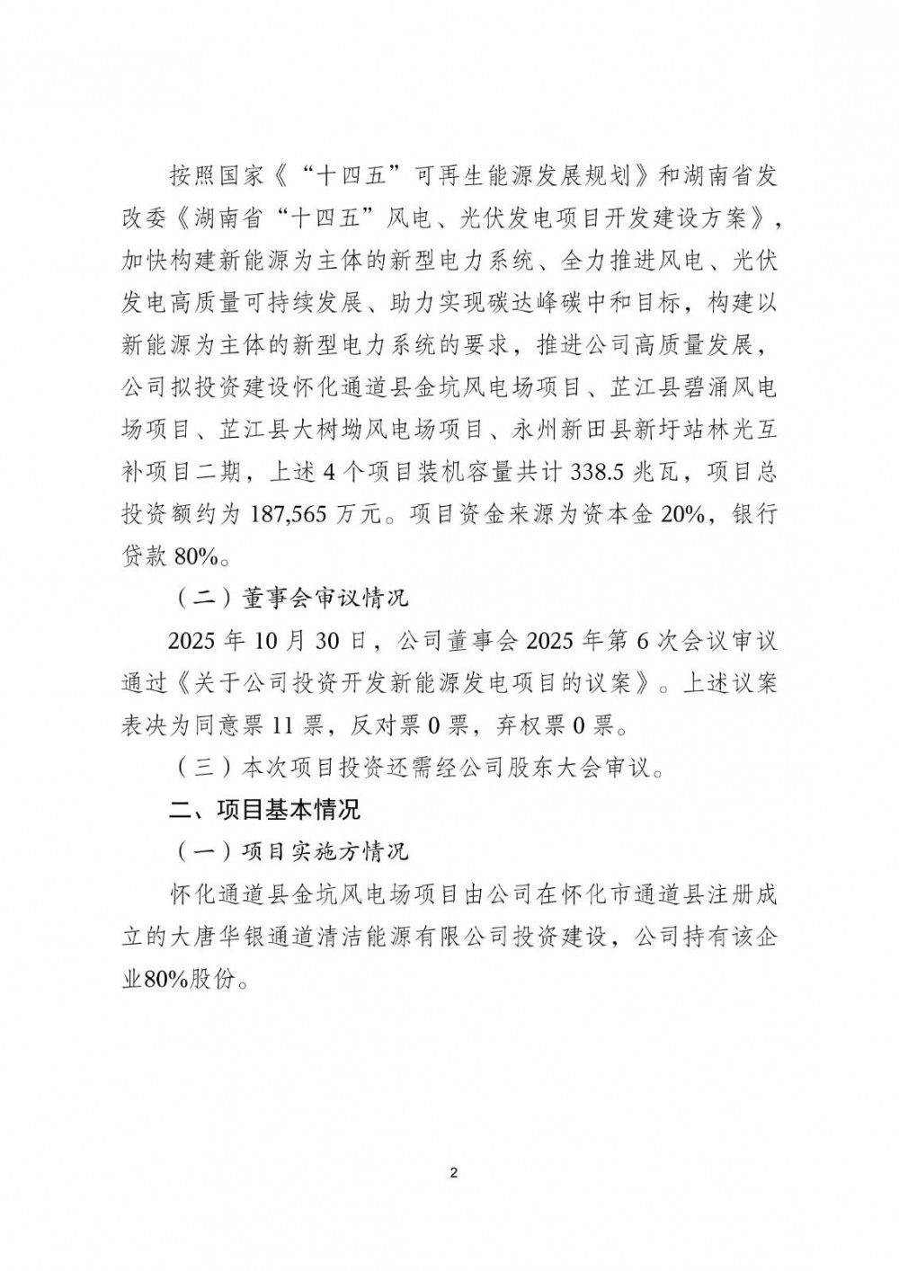 芷江县碧涌风电场项目、芷江县大树坳风电场项目由公司在怀化市芷江县注册成立的大唐华银芷江清洁能源有限公司投资建设。公司持有该企业80%股份。
