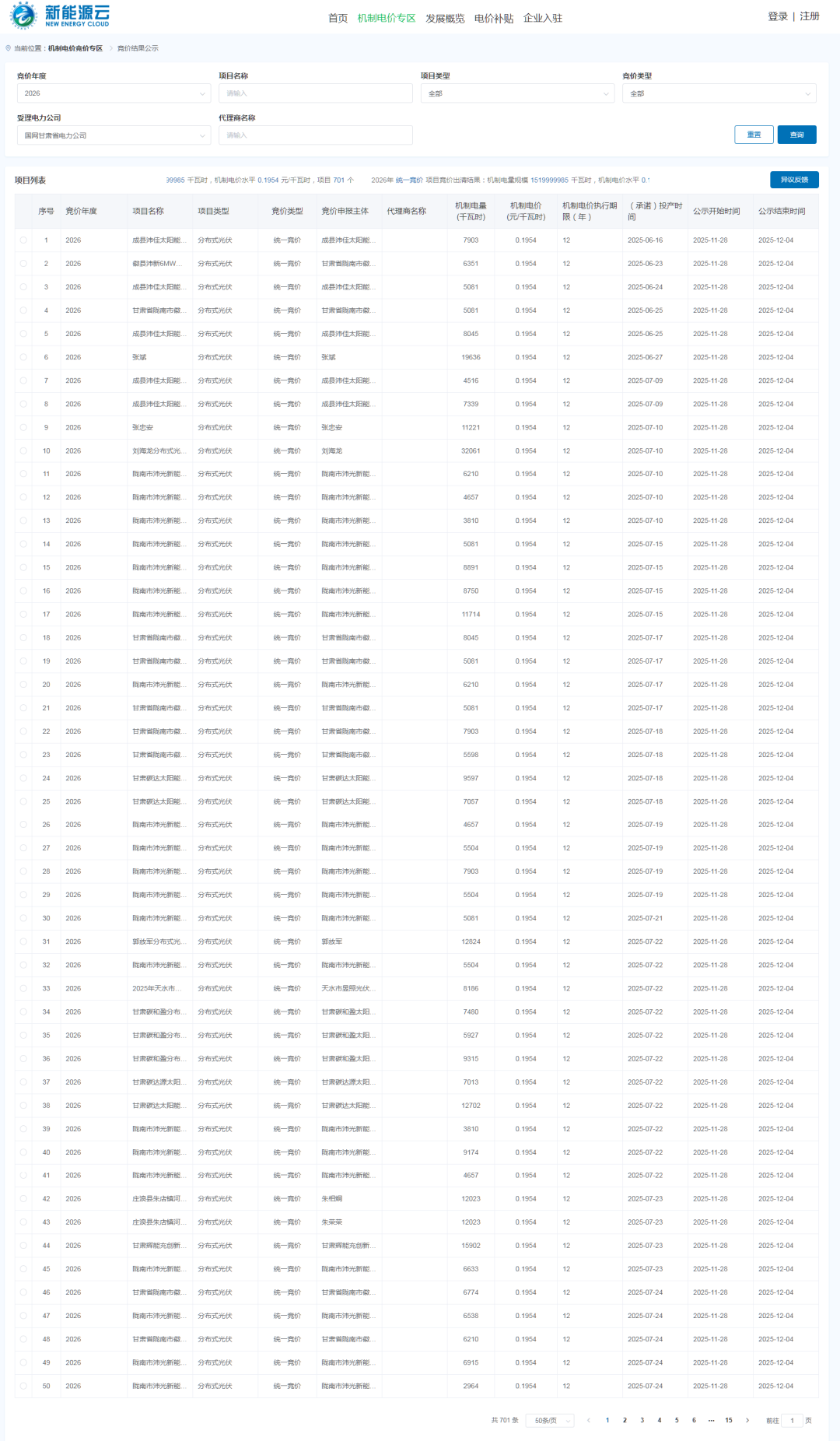 甘肃第二轮竞价仍为风、光统一竞价模式。根据公示,2026年统一竞价项目竞价出清结果:机制电量规模1519999985千瓦时,机制电价水平0.1954元/千瓦时(为下限价格),项目701个。