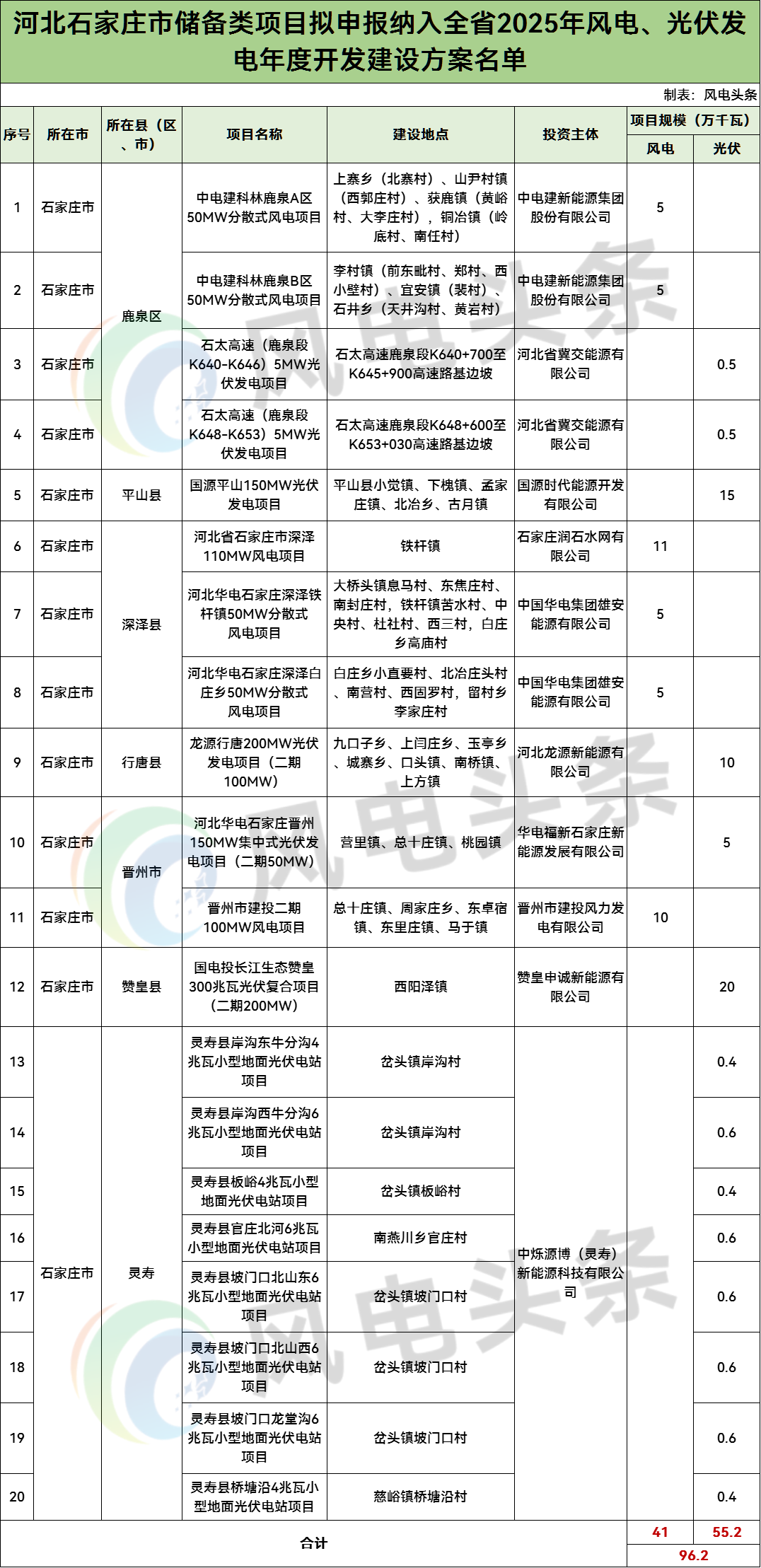 其中,风电项目6个,规模合计41万千瓦,光伏项目14个,规模合计55.2万千瓦。
