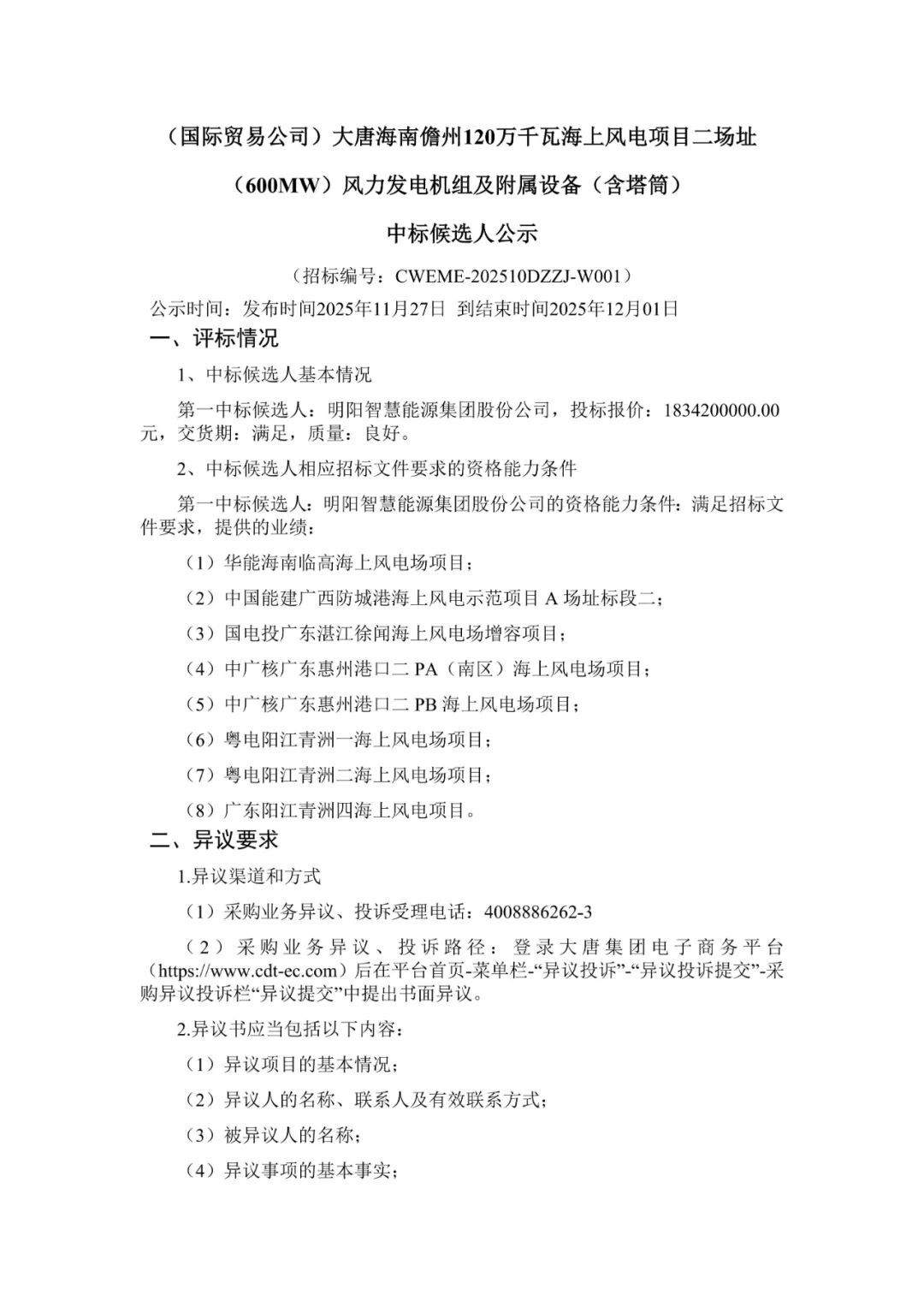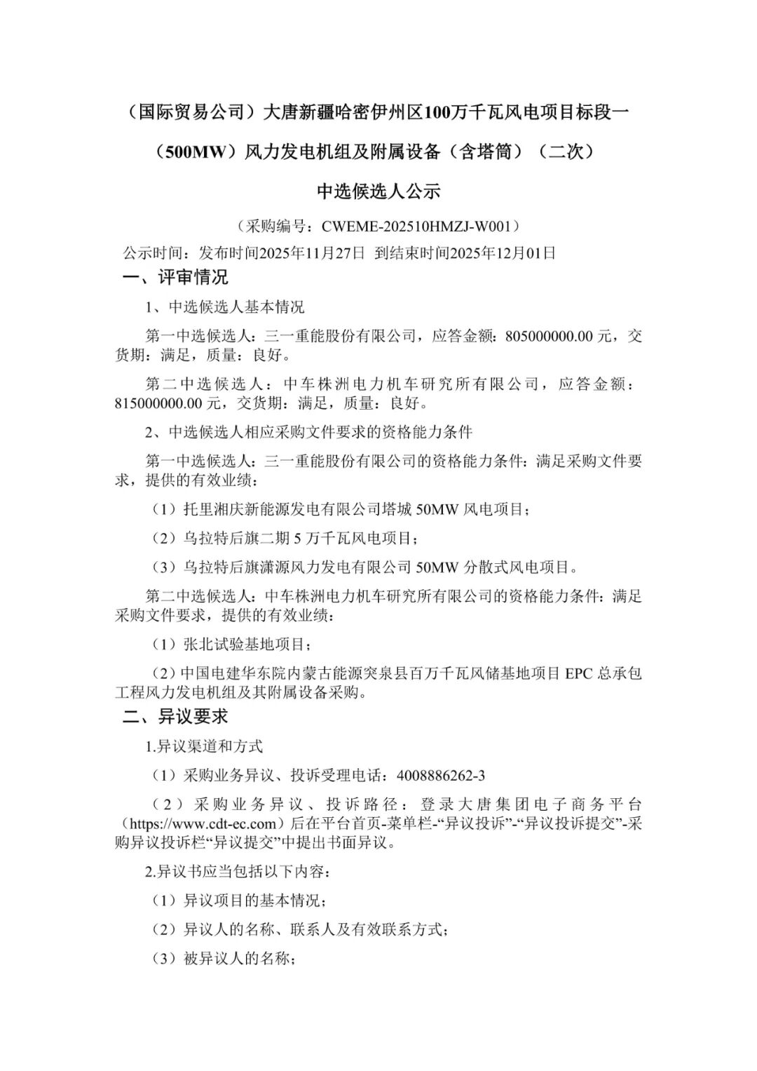 大唐新疆哈密伊州区100万千瓦风电项目标段一(500MW)位于新疆维吾尔自治区哈密市,总容量500MW,不允许上下浮动,单机容量≥8MW,不允许混排,允许单机降容运行;220m≤叶轮直径;轮毂高度≤130m(叶片运行最低点距地≥15米);限定刚性钢塔。交货日期:2026年3月开始供货,2026年4月30日完成18台,2026年6月30日供货完毕。