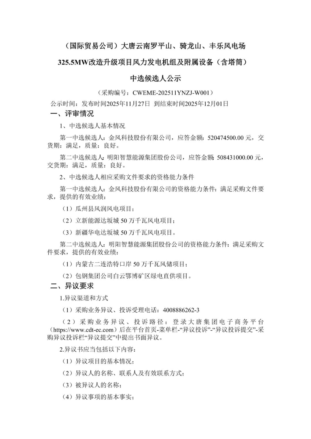 根据公示,三一重能、明阳智能、金风科技作为第一中标候选人预中标。