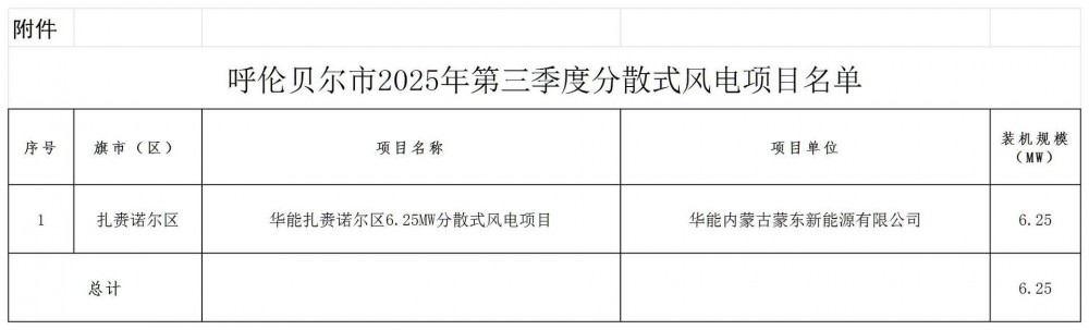 公示显示,呼伦贝尔市2025年第三季度分散式风电项目名单共包含一个风电项目,为华能扎赉诺尔区6.25MW分散式风电项目,装机规模6.25MW,项目单位为华能内蒙古蒙东新能源有限公司。