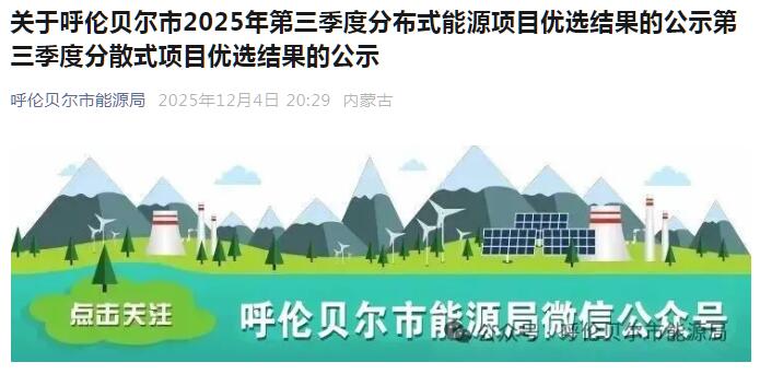 12月4日,内蒙古呼伦贝尔市能源局发布关于呼伦贝尔市2025年第三季度分布式能源项目优选结果的公示第三季度分散式项目优选结果的公示。