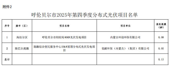 内容指出,呼伦贝尔市2025年度第四季度分散式风电项目共7个,规模合计111.55MW;呼伦贝尔市2025年度第四季度分布式光伏项目共2个,规模合计0.13MW。