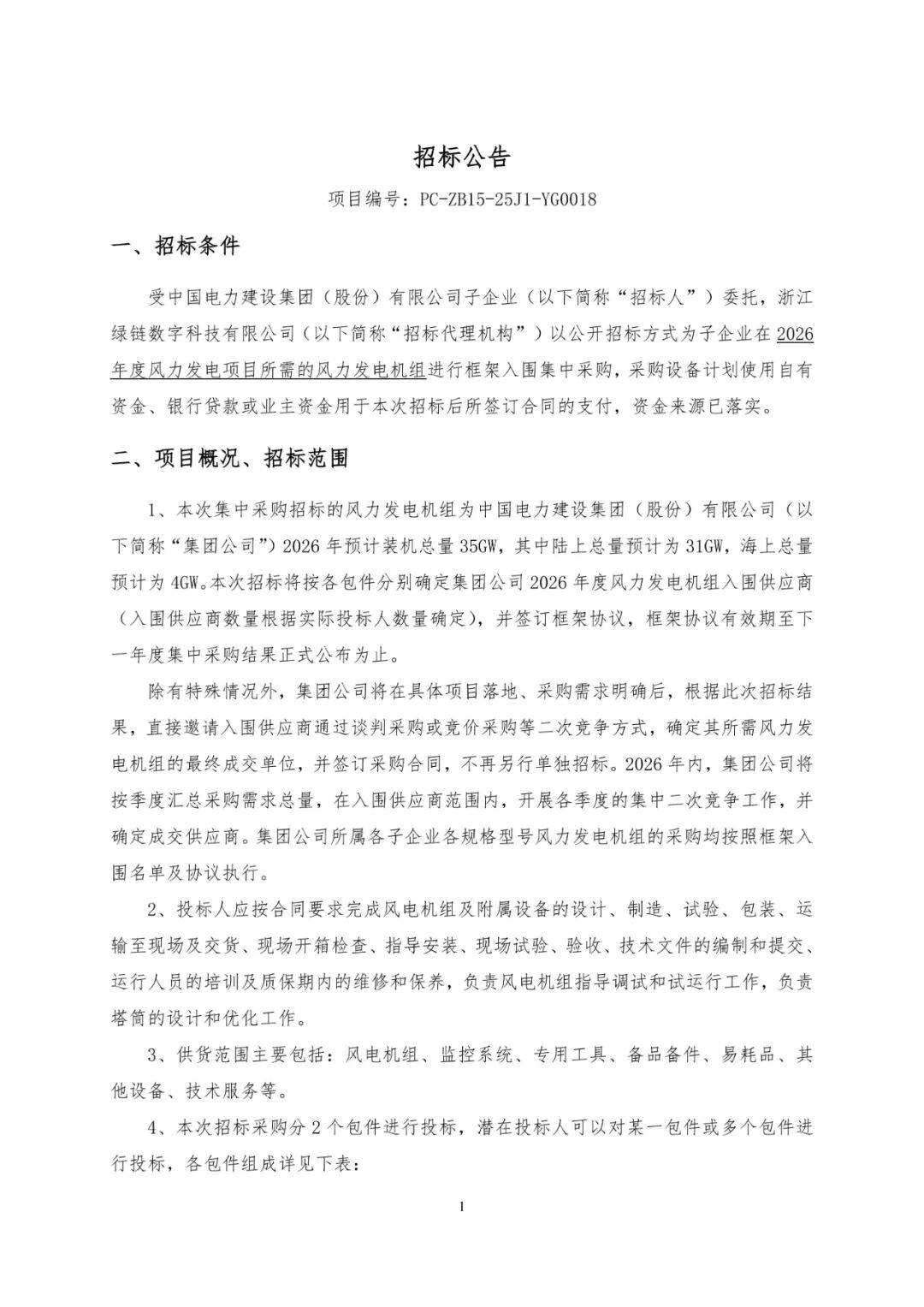电力家获悉,12月3日,中国电建2026年度风力发电机组框架入围集中采购项目公开招标公告发布。