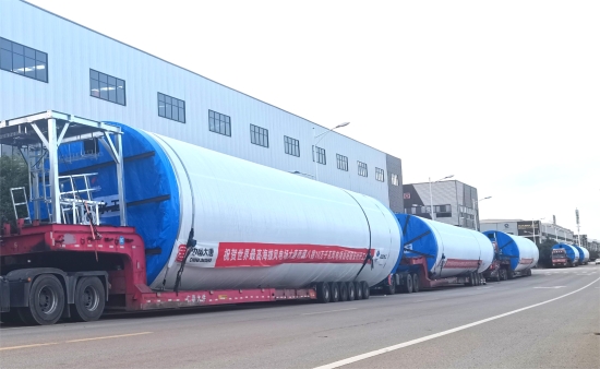 6月11日,水电七局夹江水工制造的西藏大唐国际怒江八宿县100兆瓦保障性并网风电项目首套风电塔筒发运出厂。