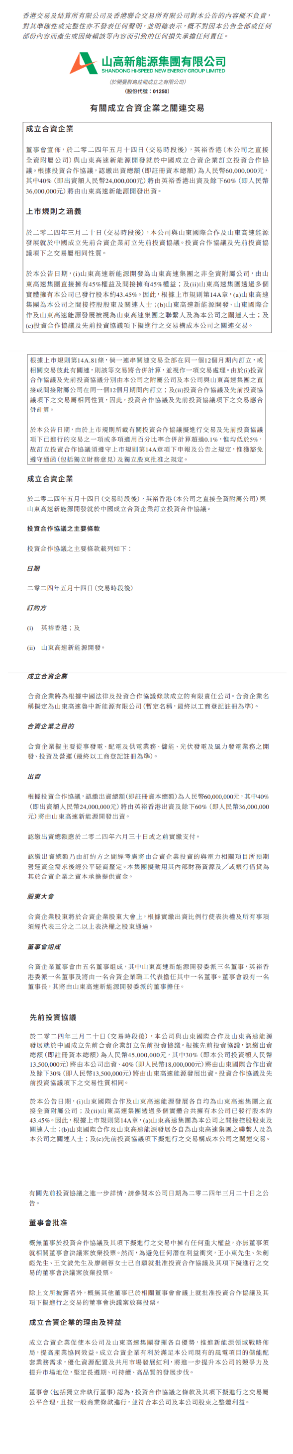 根据公告,英裕香港(公司的直接全资附属公司)与山东高速新能源开发就于中国成立合资企业订立投资合作协议。根据投资合作协议,认缴出资总额(即注册资本总额)为人民币6000万元,其中40%(即出资额人民币2400万元)将由英裕香港出资及余下60%(即人民币3600万元)将由山东高速新能源开发出资。