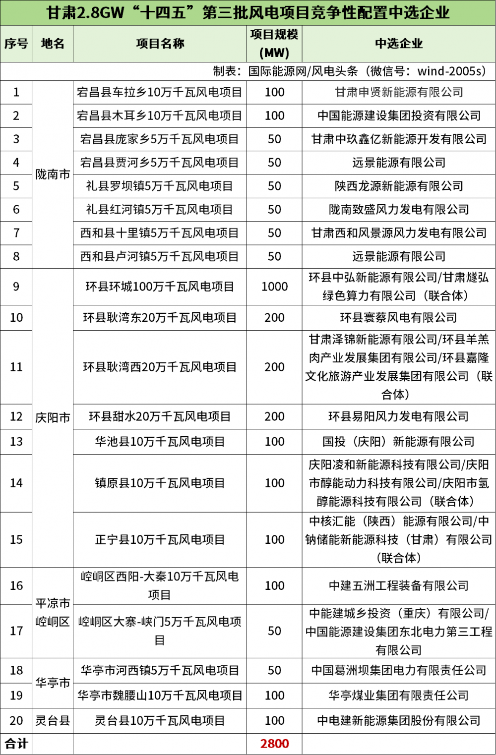 据还通过梳理,截至目前,陇南市、庆阳市、平凉市崆峒区、华亭市、灵台县“十四五”第三批新能源项目竞争性配置中选企业公示,共计20个风电项目,规模总计2800MW,25家企业中选。