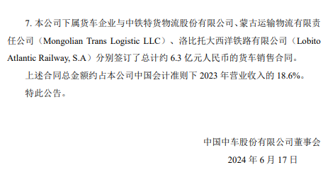 6月18日,中国中车股份有限公司(简称:中国中车)发布签订合同公告。