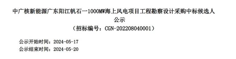 5月17日,中广核电子商务平台发布《中广核新能源广东阳江帆石一1000MW海上风电项目工程勘察设计采购中标候选人公示》的公告。