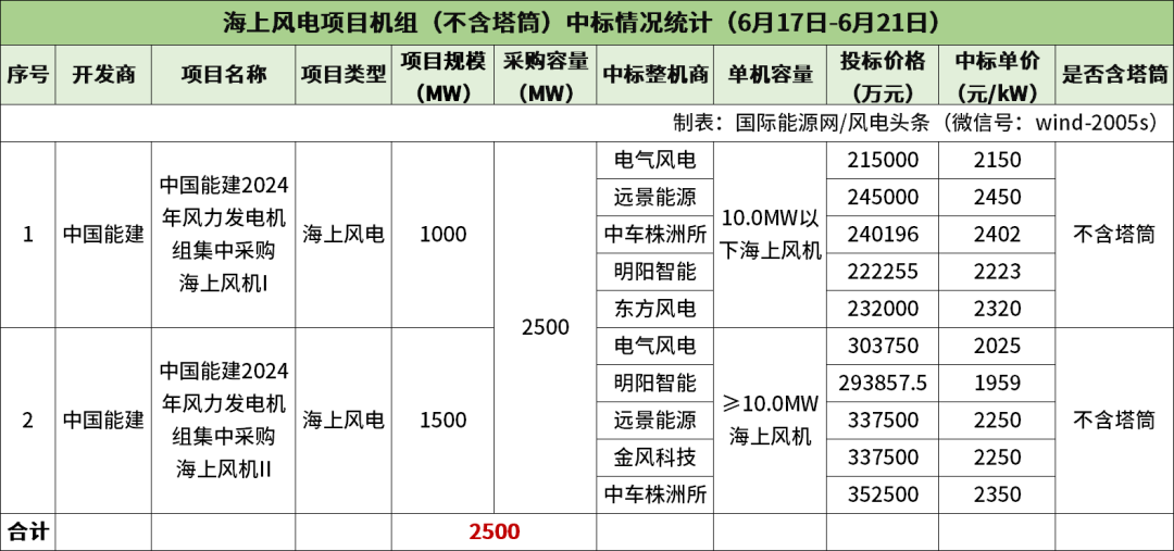 中国能建开标10000MW,金风科技、远景能源、明阳智能、运达股份、电气风电、三一重能、中车株洲所、山东中车风电、东方风电中标。