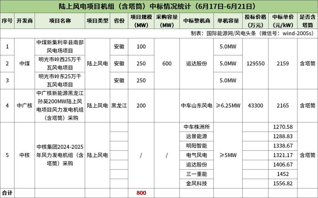 据统计,本周陆上风电含塔筒项目共计5个,规模总计800MW,项目中标均价为1551元/kW。