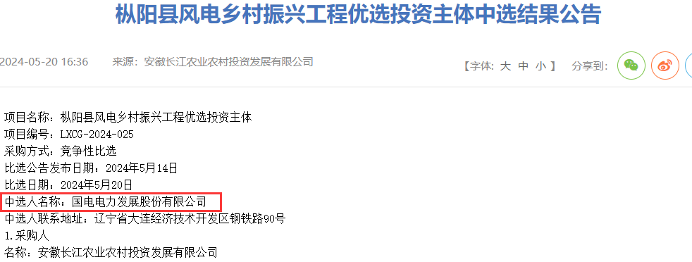 怀远县风电乡村振兴工程成交单位为华润电力新能源投资有限公司;枞阳县风电乡村振兴工程中选人为国电电力发展股份有限公司。