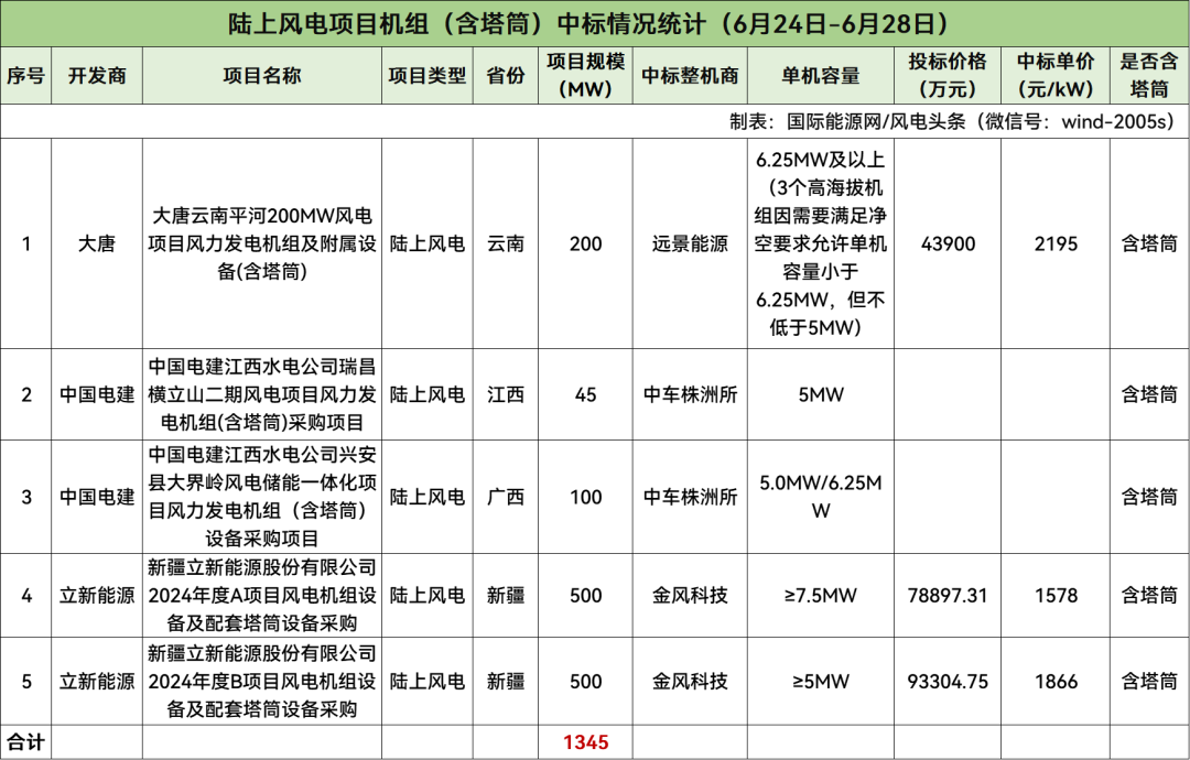 含塔筒陆上风电1345MW中标均价1880元/kW