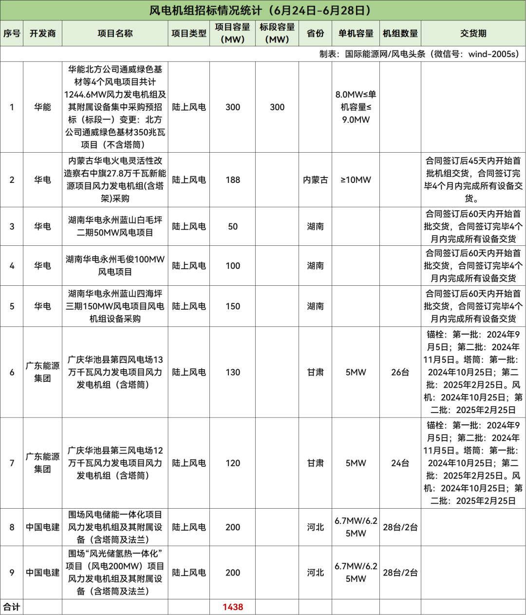 统计,本周风机招标市场方面,共有9个风电项目、1438MW风机启动采购,开发商是华能、华电、广东能源集团、中国电建4家。