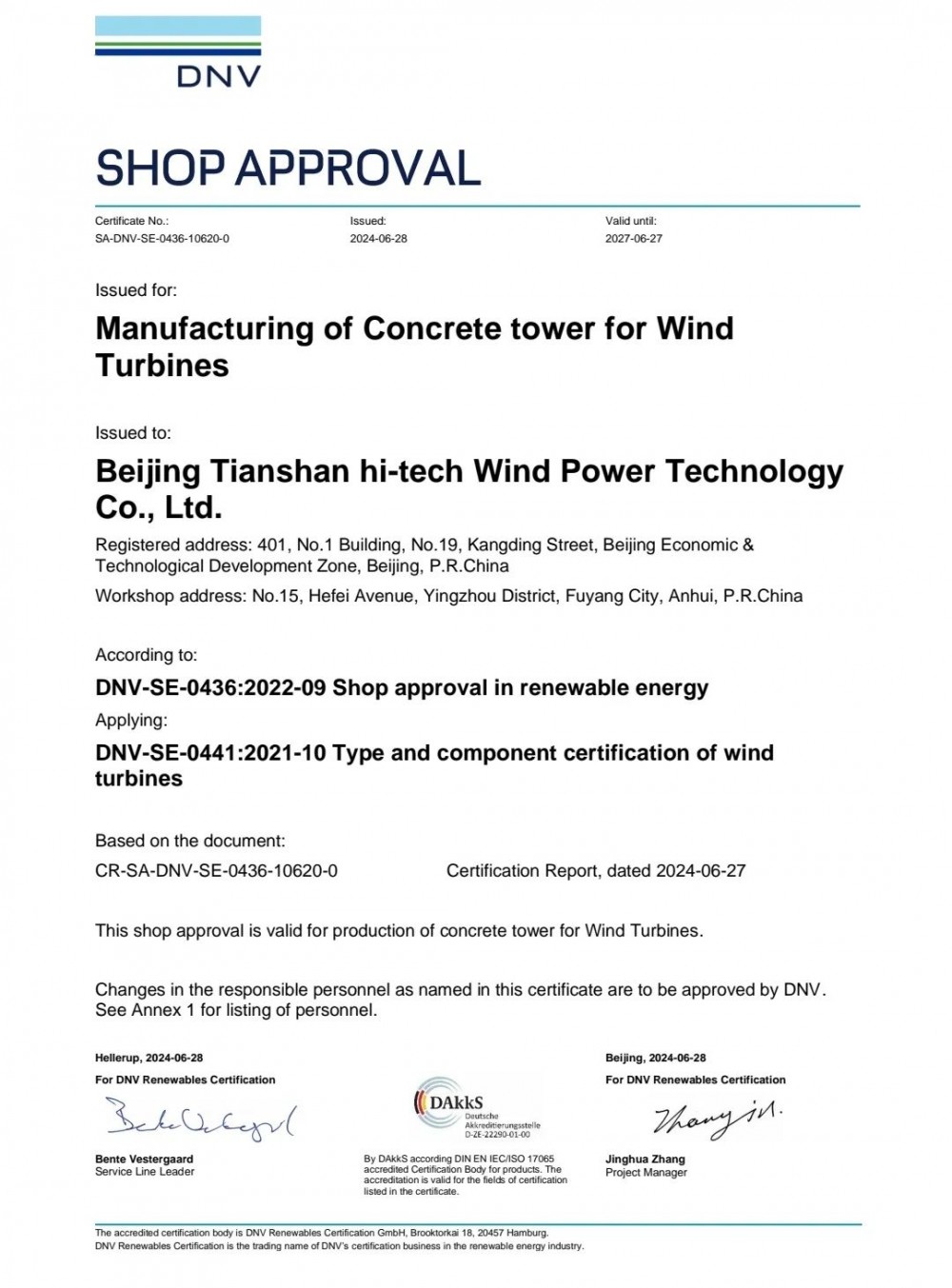 DNV是全球公认的在风力发电认证领域最权威的检测、认证机构之一。本次认证参照由DNV发布的DNV-SE-0436标准执行,对天杉高科阜阳预制厂进行了文件体系、管理流程、质量控制和生产全过程等方面的严格评估与验证,最终颁发认证证书。本次认证中梳理的体系文件、工艺流程及供应商管理办法能够在国际上通用,将为金风科技未来海外建厂、型式认证等业务的开展减少障碍、提高效率,同时为金风混塔产品在全球范围树立优质品牌形象提供坚实的保障。