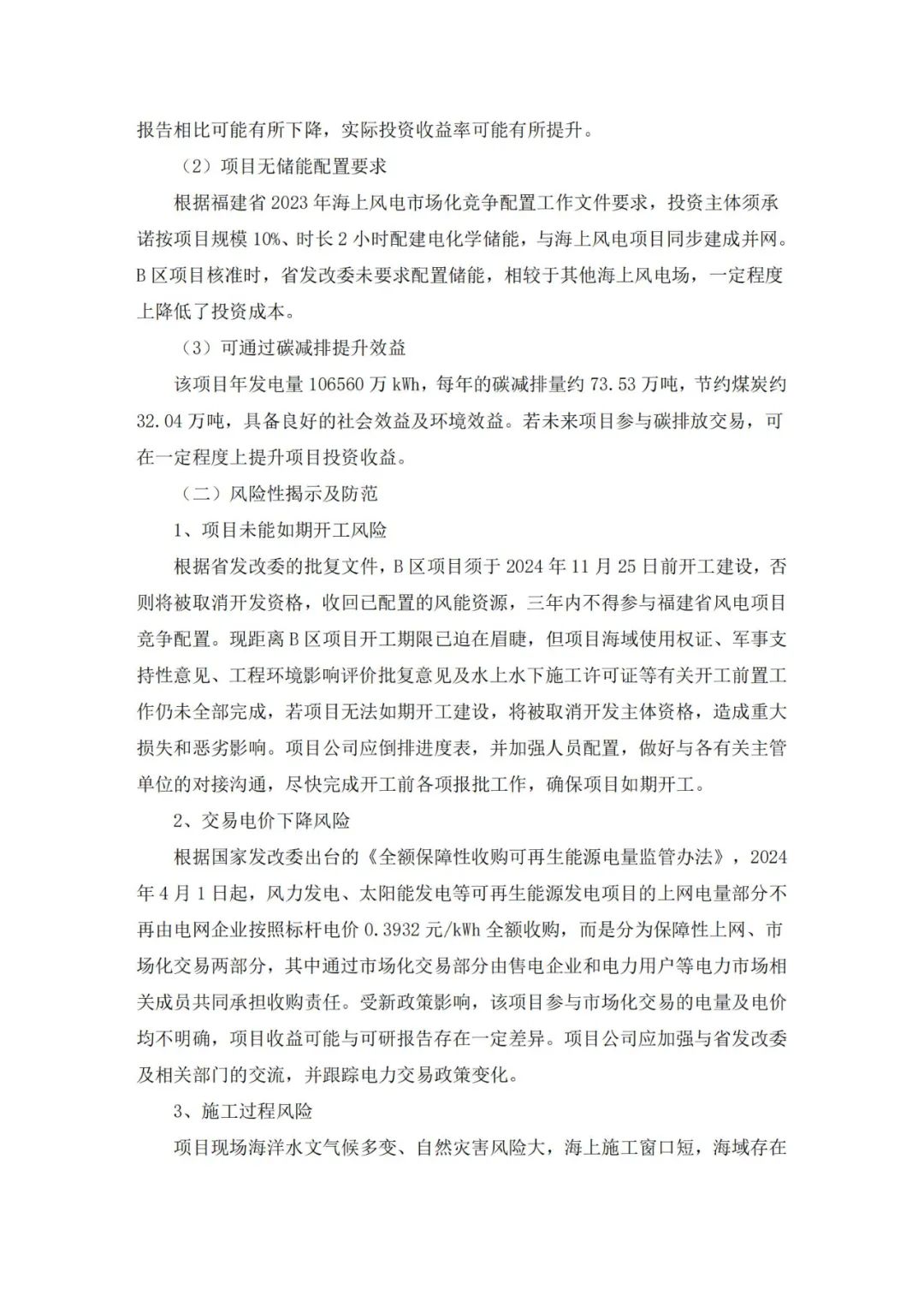根据福建省水利水电勘测设计研究院有限公司及福建永福电力设计股份有限公司联合编制的项目可研报告,项目装机容量296MW,拟安装37台8MW 风机,项目总投资40.91亿元,运营期25年,建设期限24个月,等效满负荷小时数3600h,上网电价按目前福建省燃煤标杆上网电价0.3932元/kWh,建成投产后年上网电量106560万 kWh,年销售收入37449.9万元,年利润总额10380.58万元。