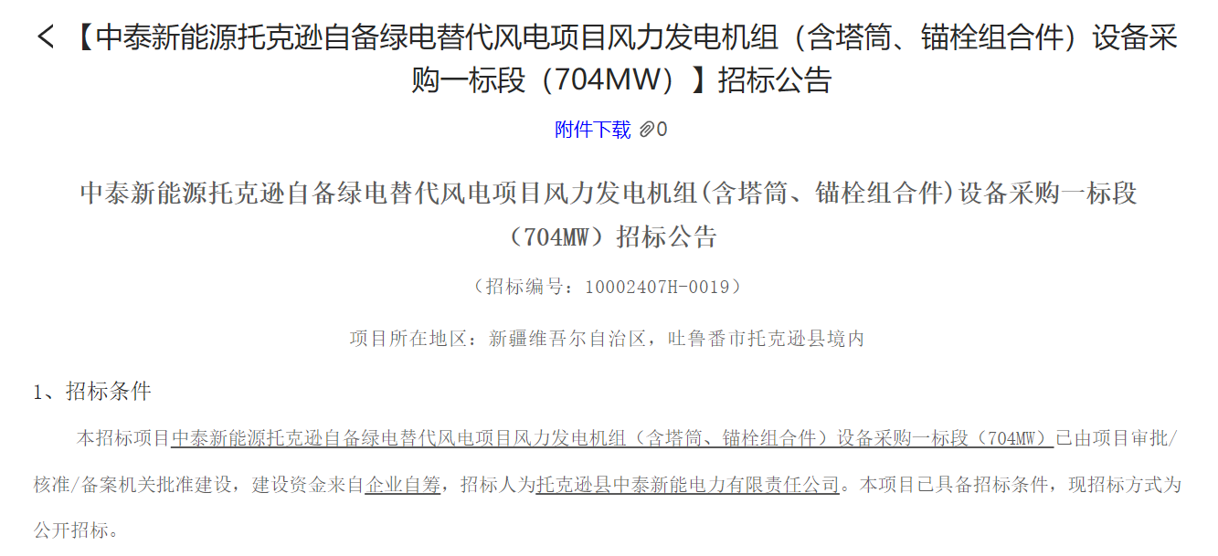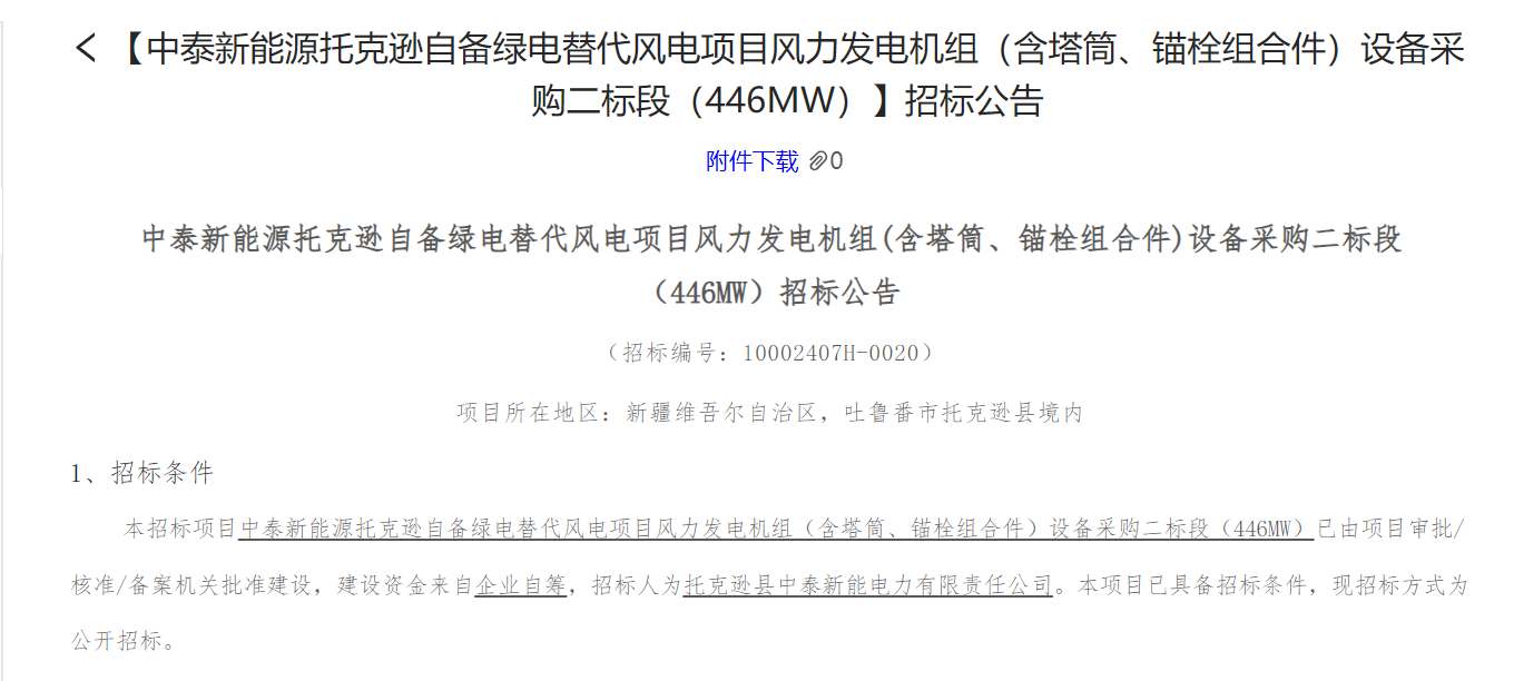 7月12日,中泰集团招标投标网发布中泰新能源托克逊自备绿电替代风电项目风力发电机组(含塔筒、锚栓组合件)设备采购一标段(704MW)、二标段(446MW)招标公告。