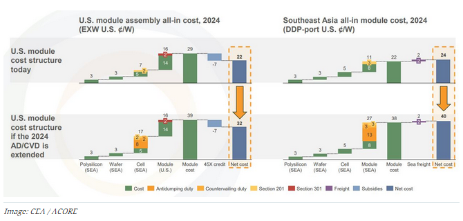 根据美国清洁能源协会(CEA)制定的模型,光伏产品反倾销/反补贴关税将使美国制造的光伏组件成本增加10美分/W,进口组件成本增加15美分/W,这将显著影响光伏项目的经济性。一位买家表示,目前美国完税后交货(DDP)OPCon光伏组件的价格已经上升到0.3美元/W的中低水平。这一定价包括201条款双面光伏组件的关税,但不包括新的反倾销/反补贴税。