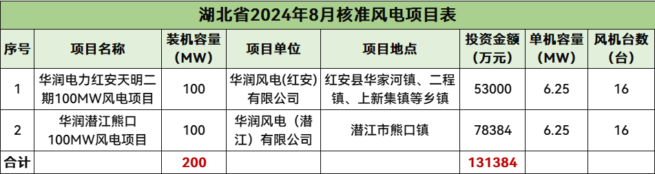 湖北核准2个风电项目,总规模200MW,总投资131384万元,均为陆上风电项目。