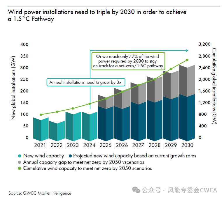 然而,GWEC警告称,一些市场的政策不稳定性日益增加,并指出需要改进许可、电网传输和拍卖机制,以保持全球电气化趋势,实现各国的能源和气候目标,减少对化石燃料的依赖,并实现全球商定的到2030年将可再生能源容量增至三倍的目标。