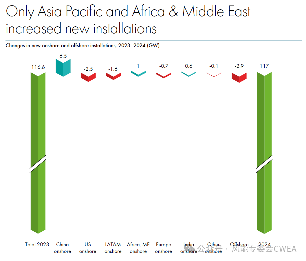 GWEC指出,尽管2024年是风电装机量创纪录的一年,但总体数据掩盖了全球市场的巨大差异,其中大部分装机量发生在包括中国和欧洲在内的少数成熟市场。